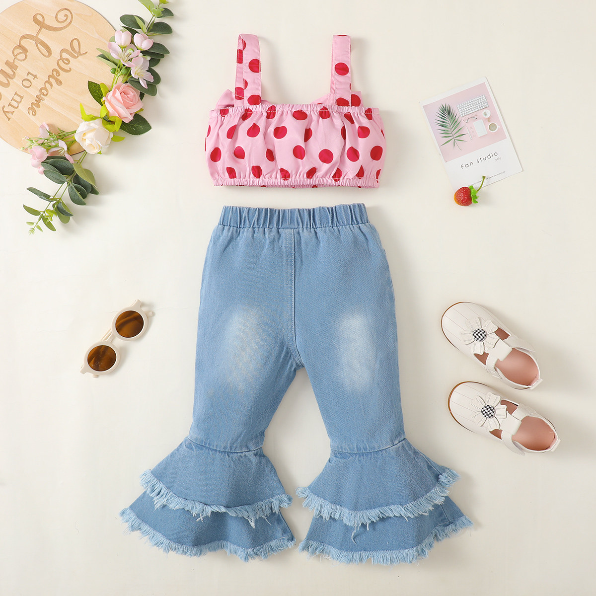 Toddler Girls Straps Plaid Polka Dot Top & Pants Wholesale