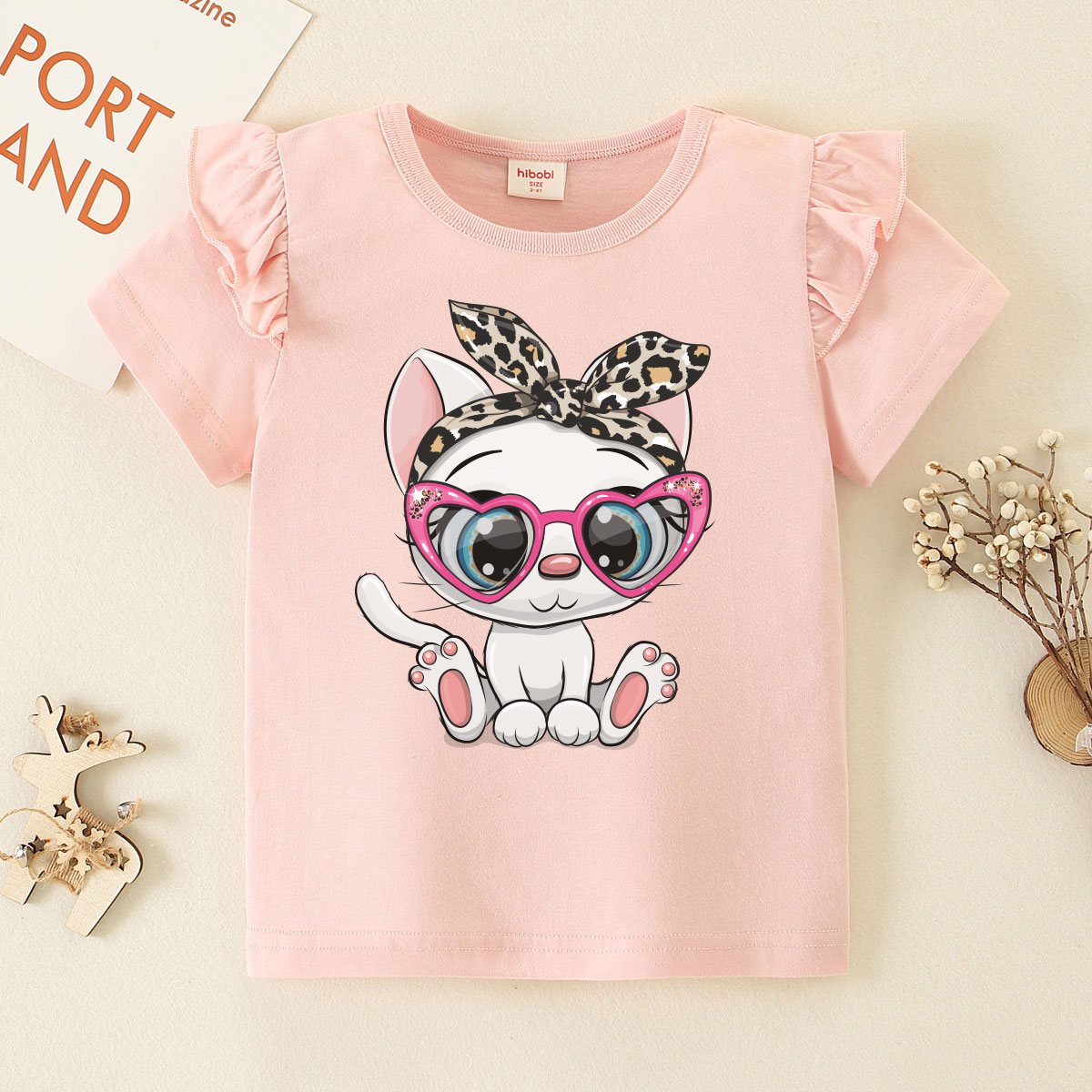 Toddler Girl Baby Heart Shaped Glasses Cat Print Fly Sleeve Short Sleeve Wholesale