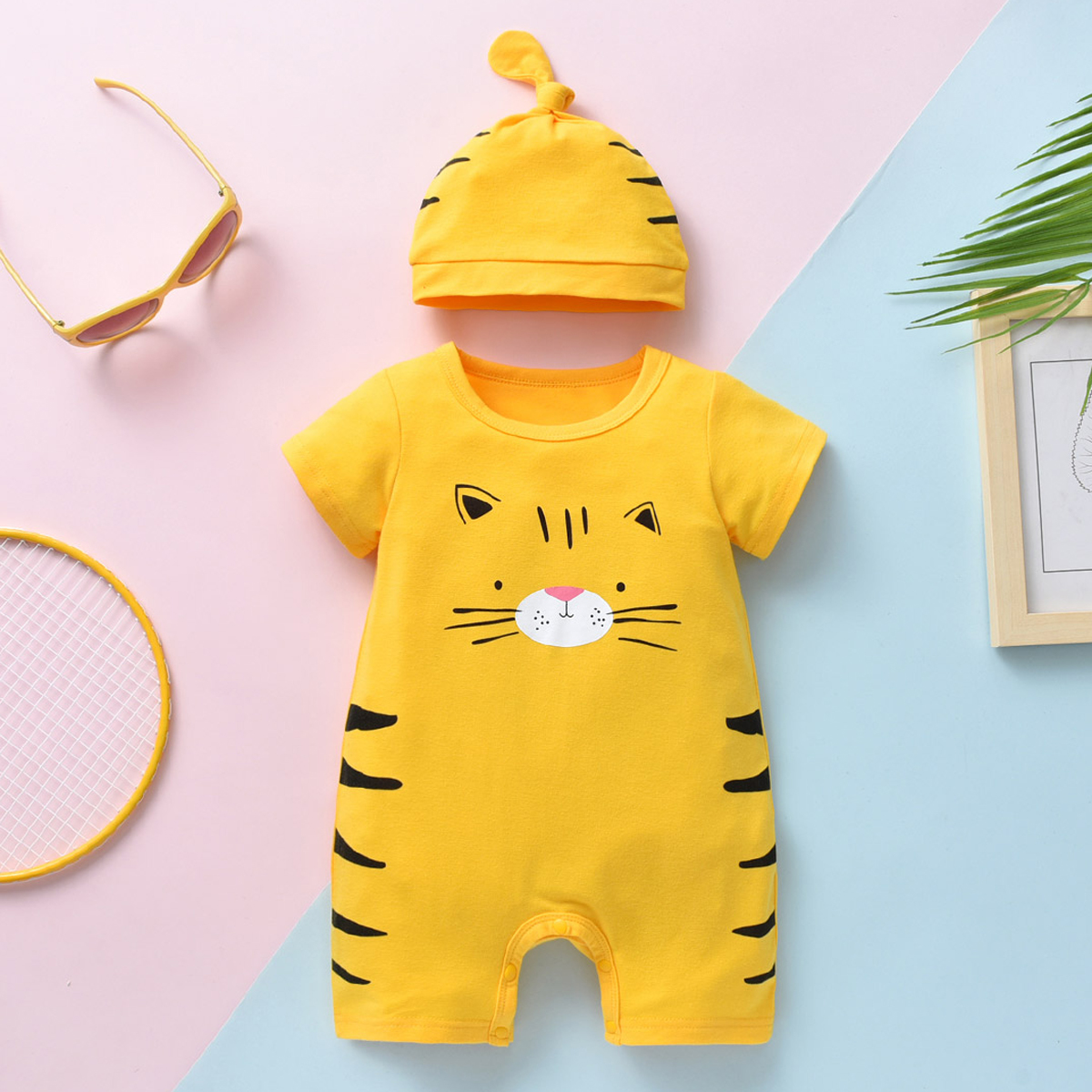 Baby Short Sleeve Animal Print Bodysuits with Hat Wholesale