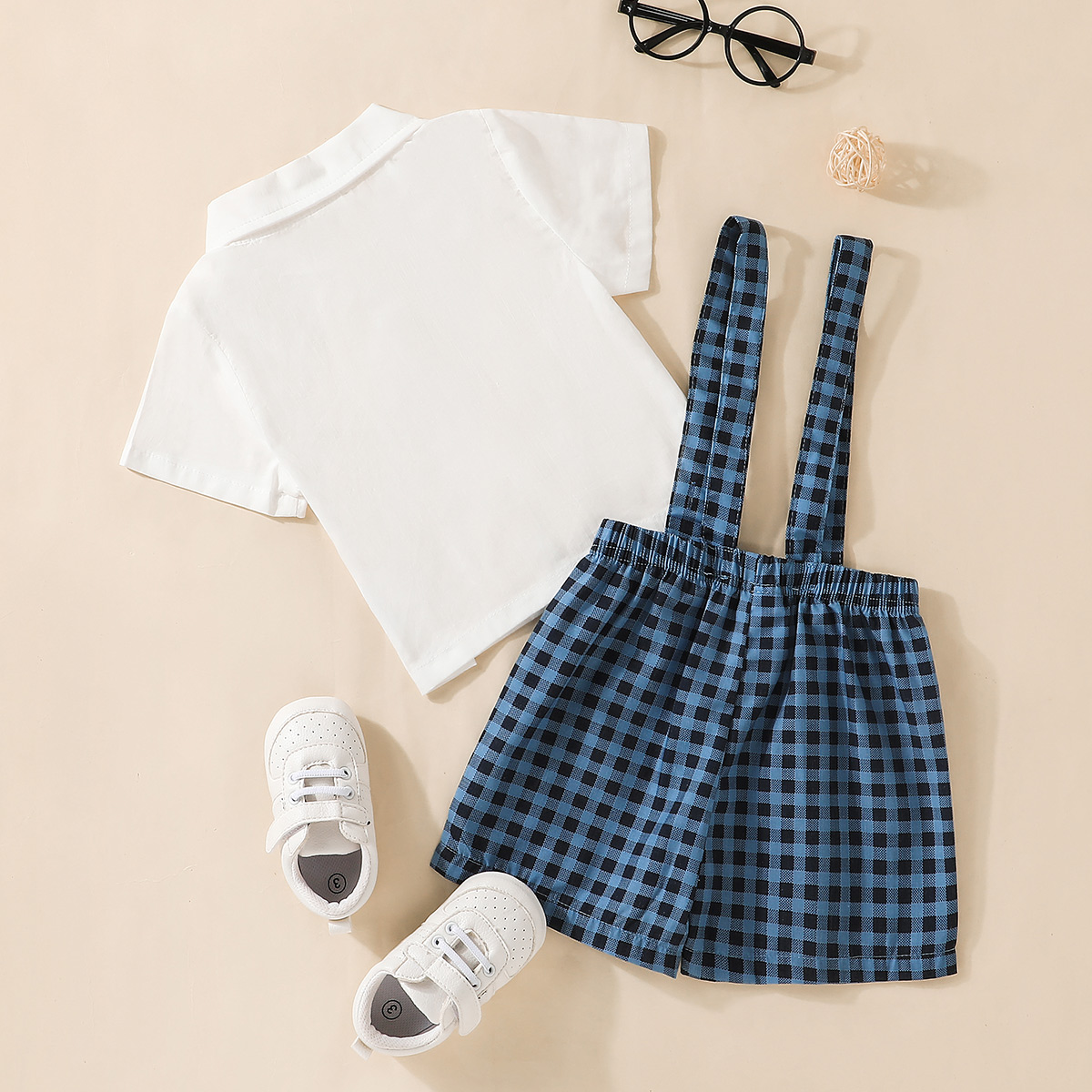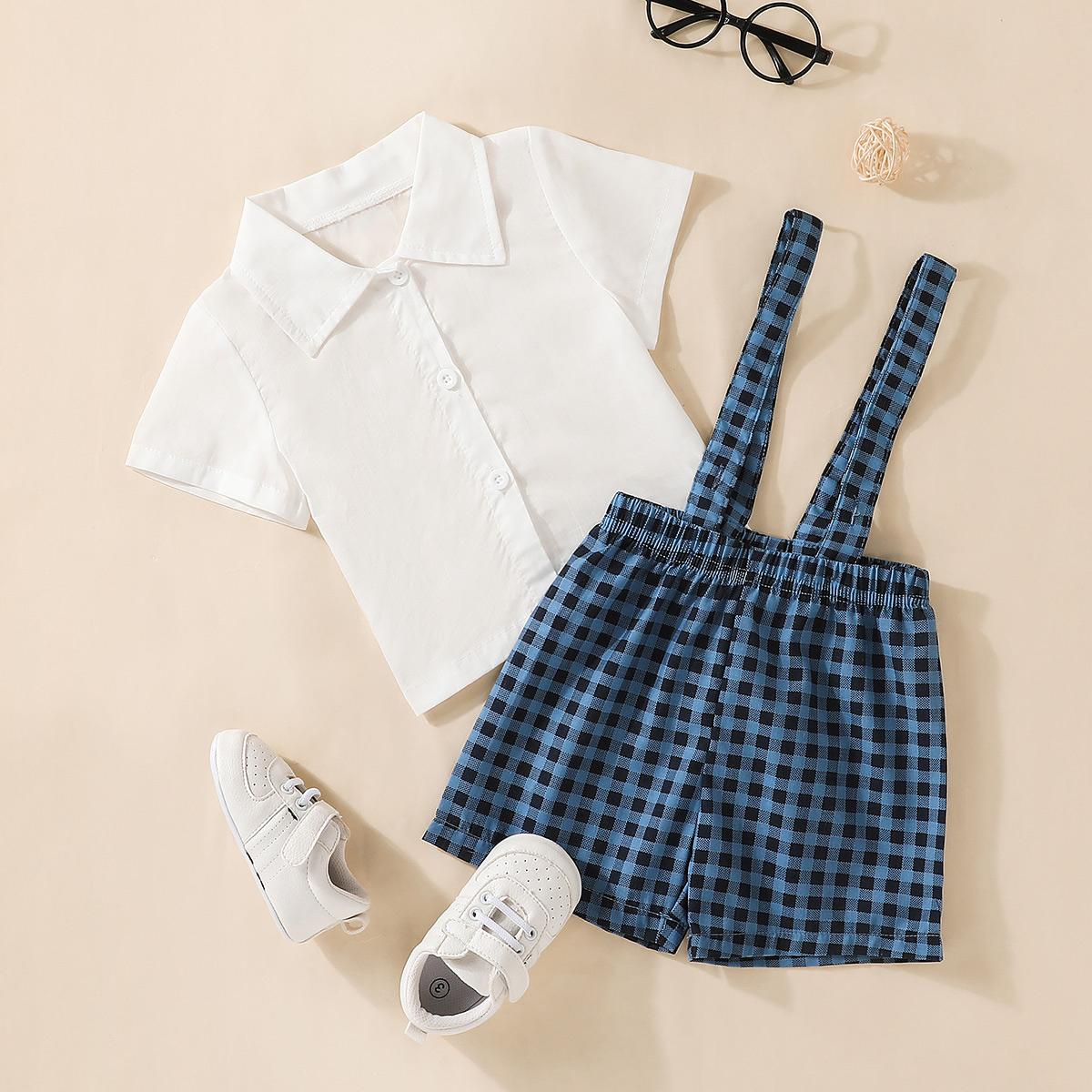 Baby Boy Short Sleeve Shirt And Plaid Overalls Shorts Wholesale