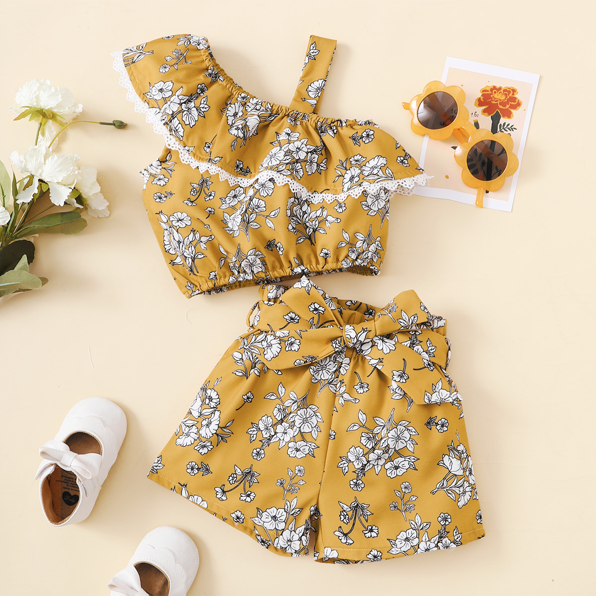 Baby Girl Floral Print One-shoudler Top And Shorts Wholesale
