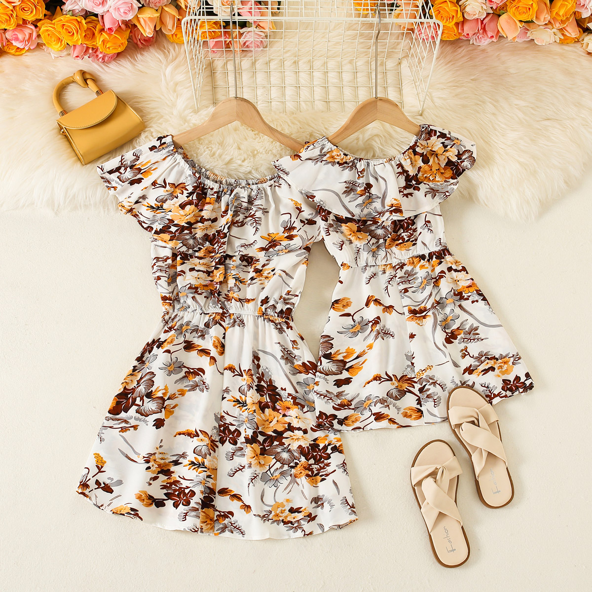 Causal Floral Print Short Sleeve Off Shoulder Dress for Mom and Me Wholesale