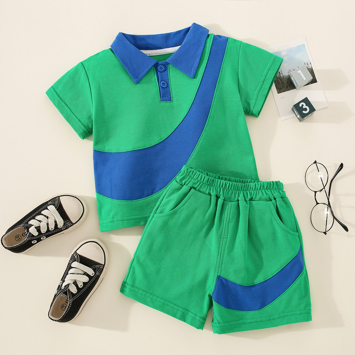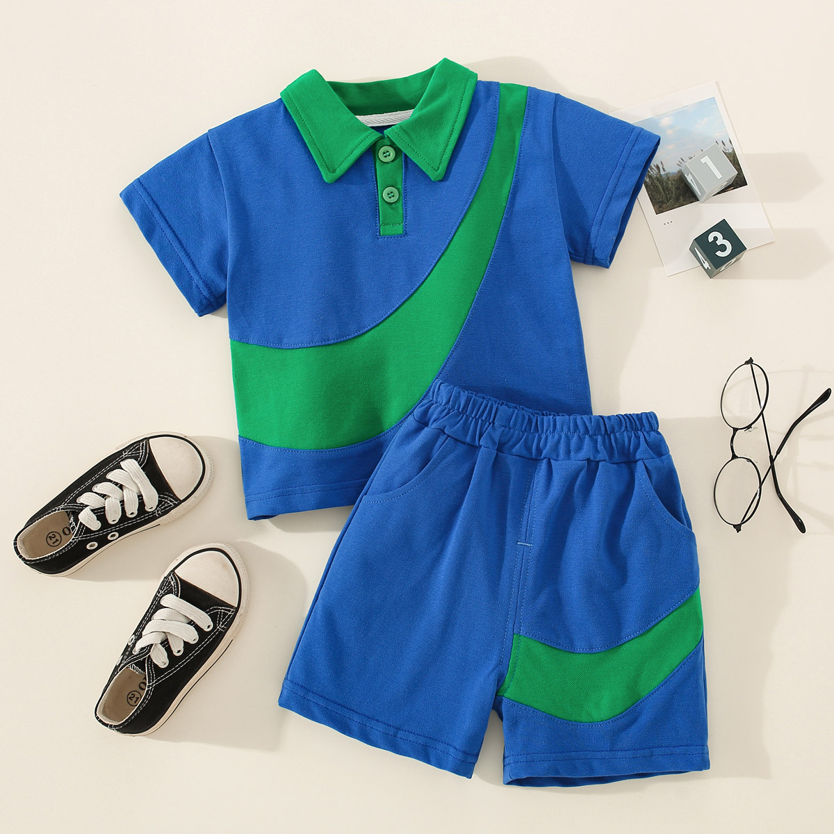 Toddler Boy Polo Collar Pocket Color-block Top & Shorts Wholesale