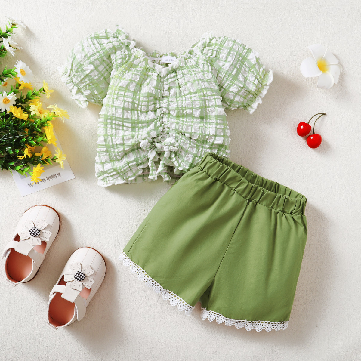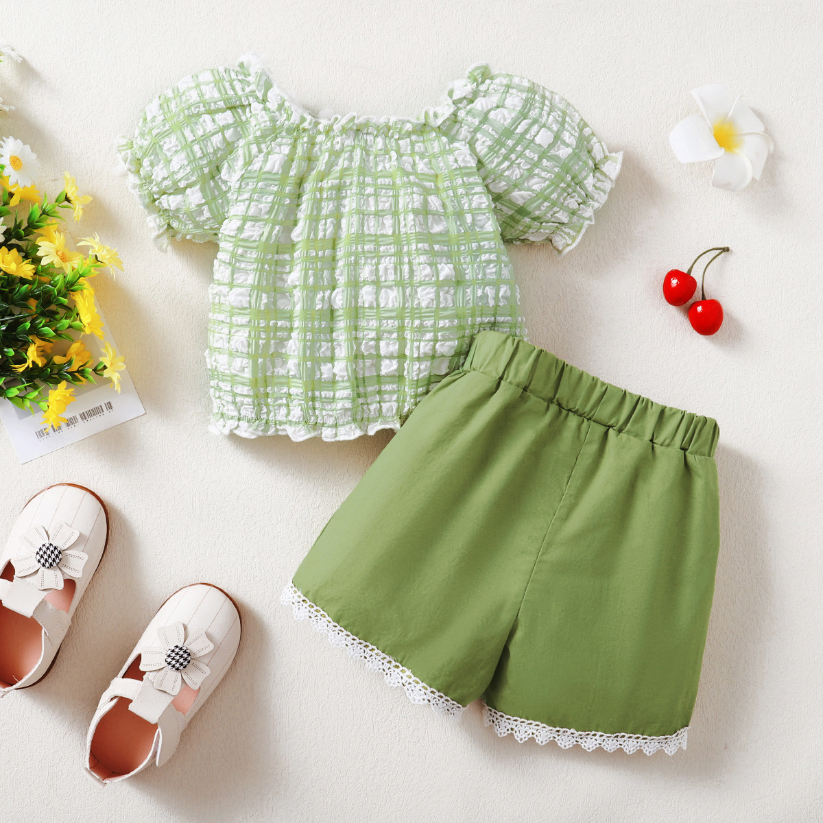 Toddler Girls Puff Sleeve V-neck Top & Lace Shorts Wholesale