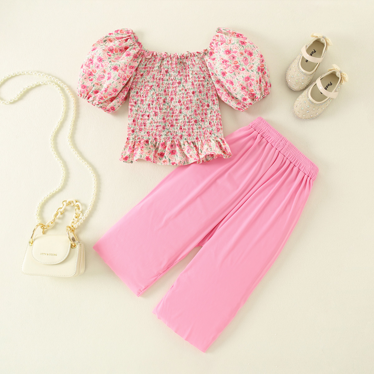 Toddler Girls Floral Pleats Puff Sleeve Top & Cropped Pants Wholesale