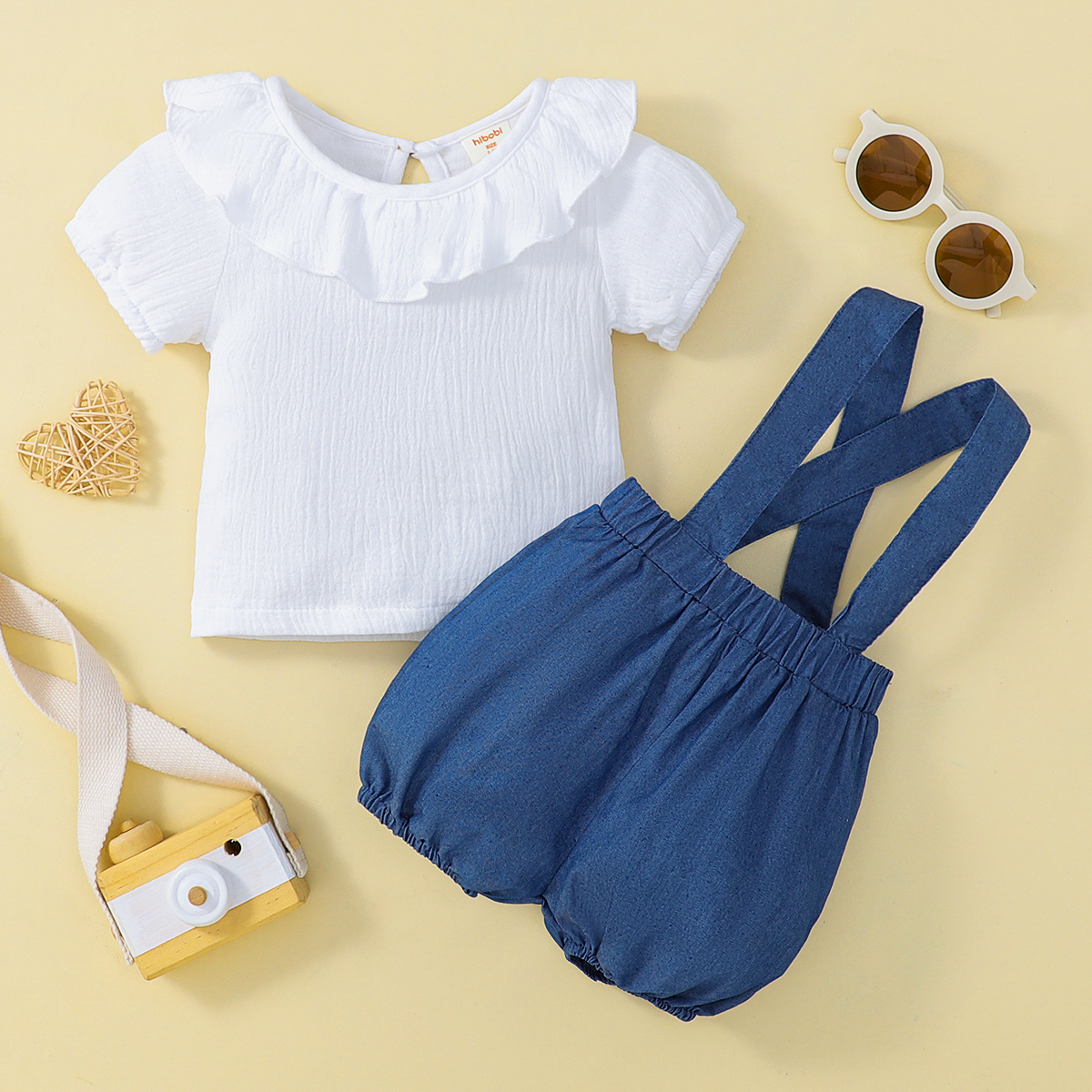 hibobi Girl Baby Solid Ruffled Denim Strappy Trousers Set Wholesale