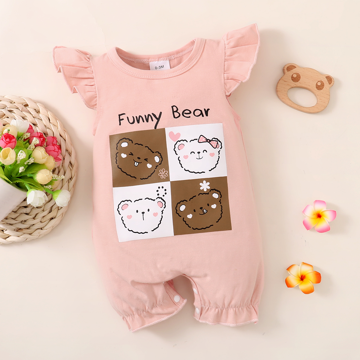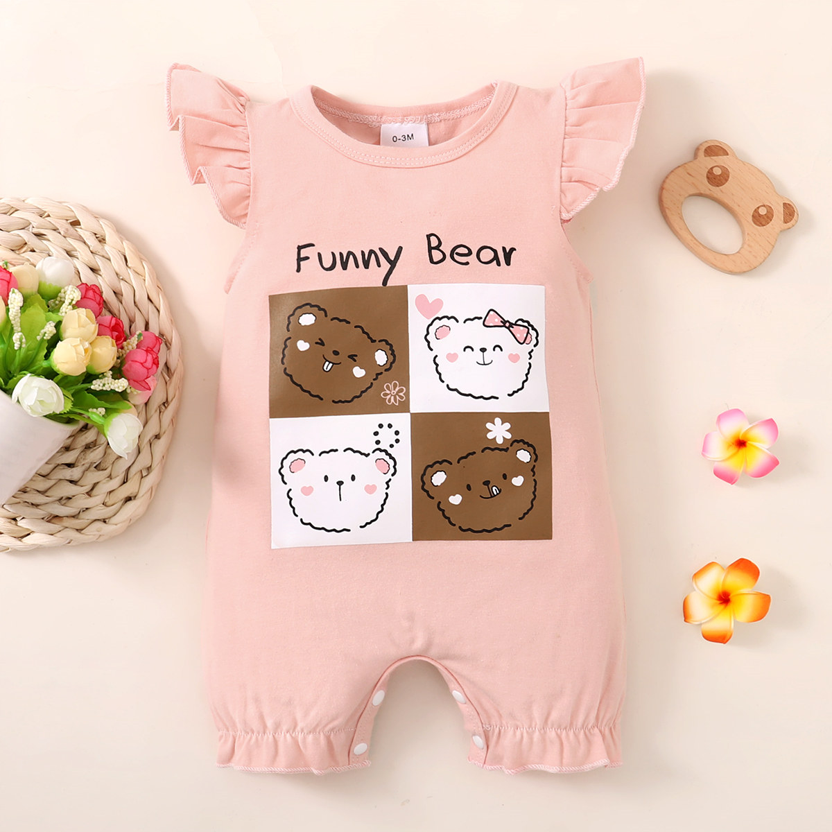 Baby Girl Solid Color Bear Pattern Ruffle-sleeve Romper Wholesale