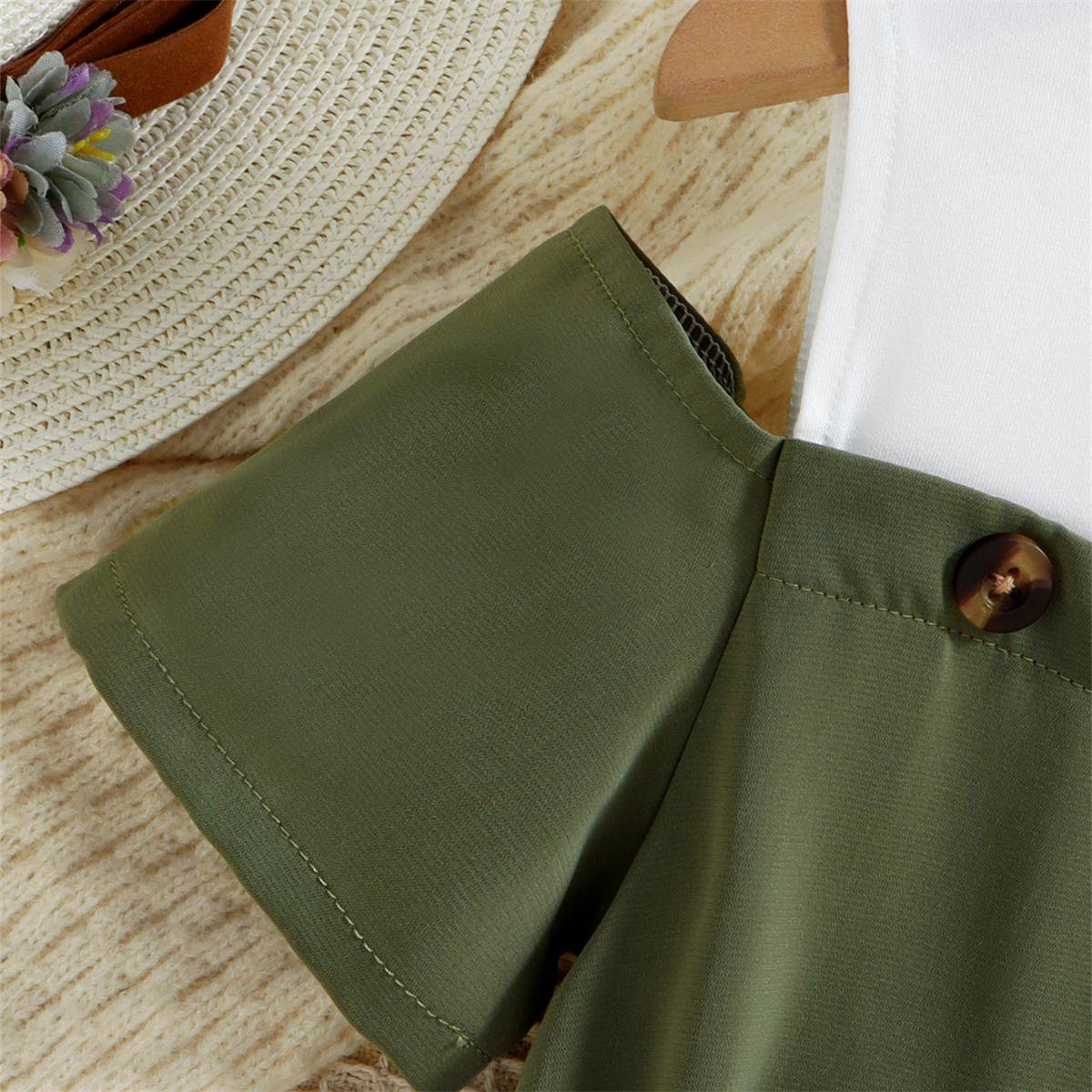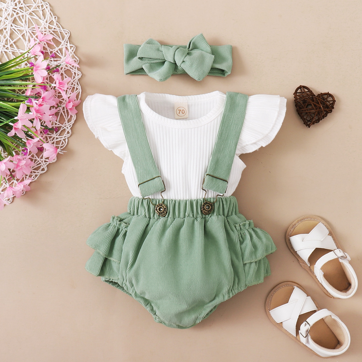 Baby Girl Solid Color Ruffle-sleeve T-Shirt & Suspender Thin Corduroy Shorts & Headband Wholesale