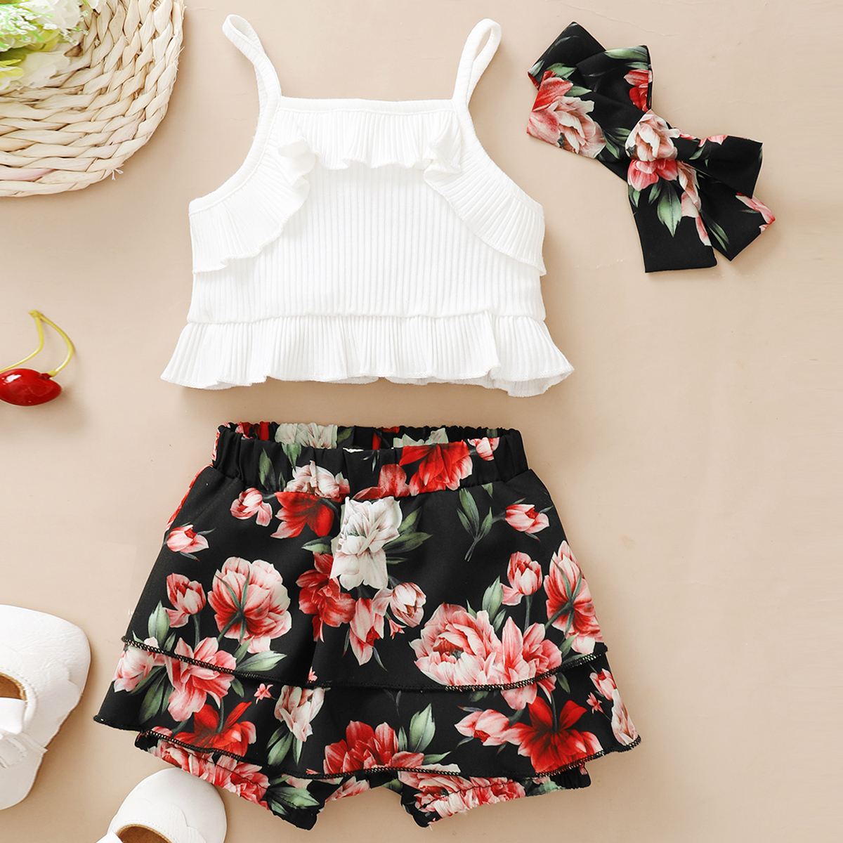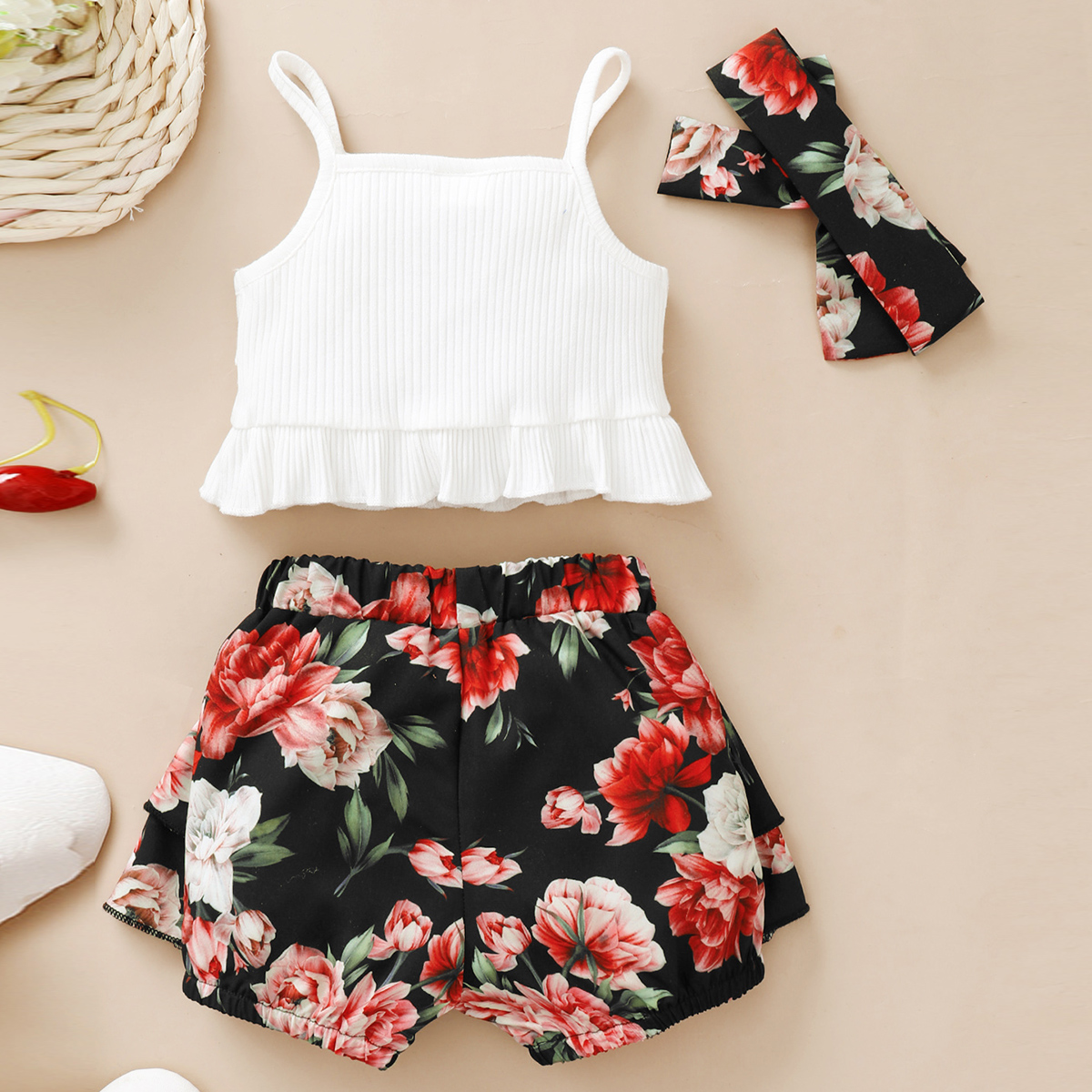 Baby Girl Solid Colour Sling Top And Ruffle Floral Short with Headband Wholesale