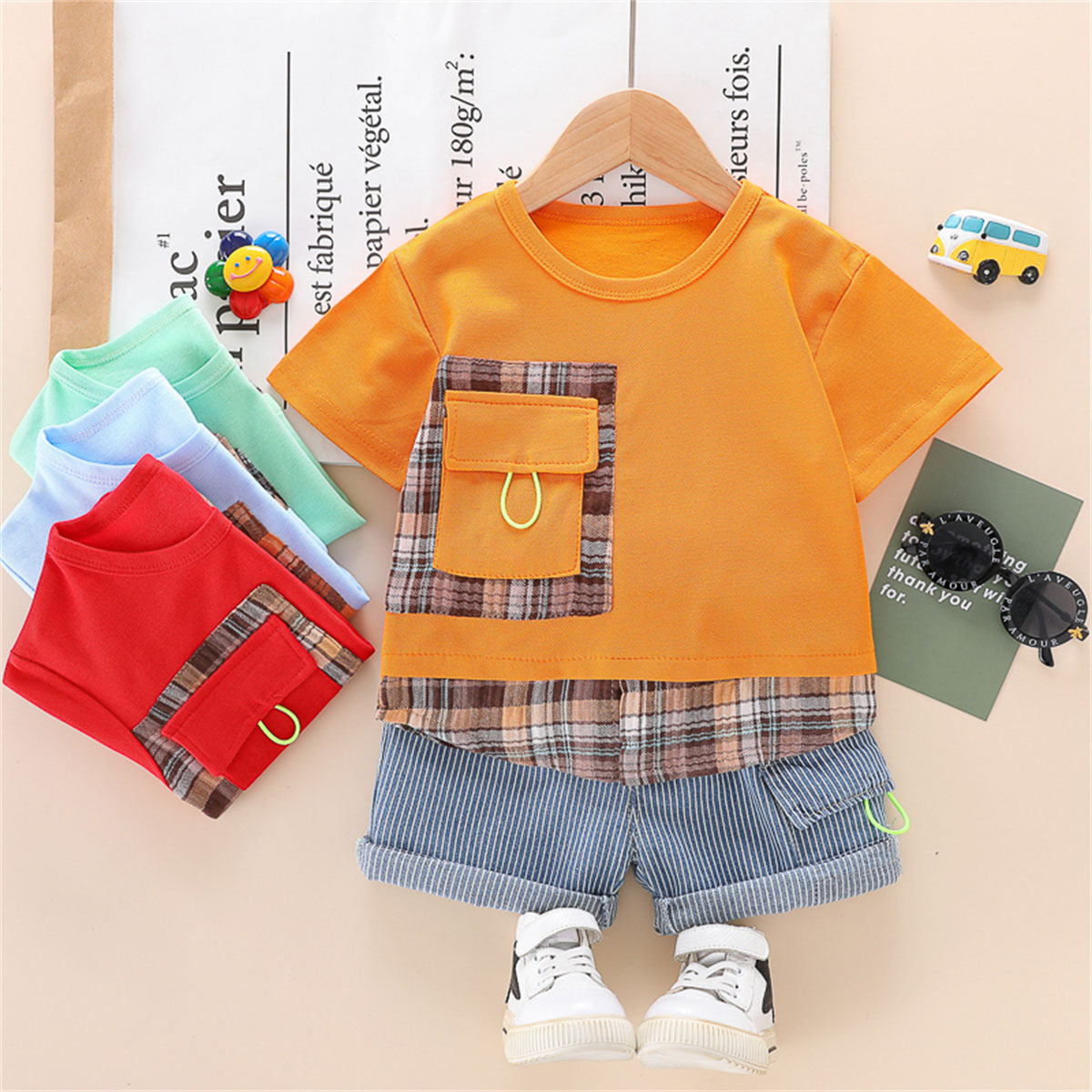 Baby Boy Patchwork Pocket Top And Vertical stripes Shorts Wholesale