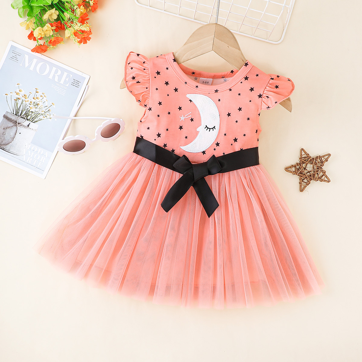 Baby Girl Star And Moon Print Patchwork Tulle Dress Wholesale