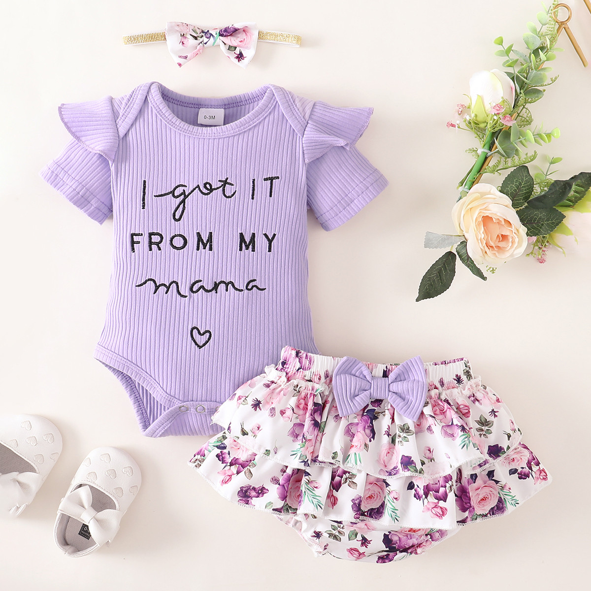 Baby Girl Letter Pattern Bodysuit & Floral Pattern Shorts & Headband Wholesale