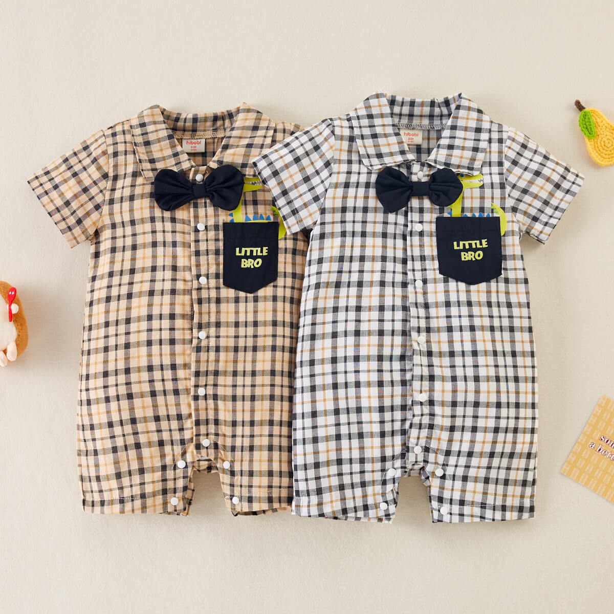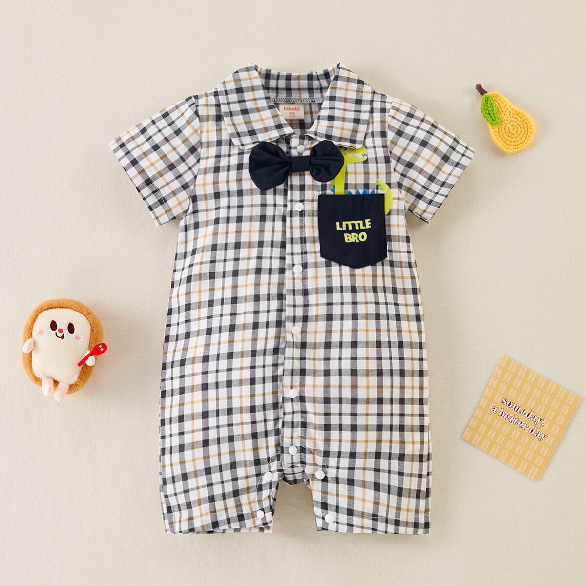 hibobi Baby Boy Cartoon Dinosaur Print Bow Tie Short Sleeve Cotton Plaid Jumpsuit Wholesale