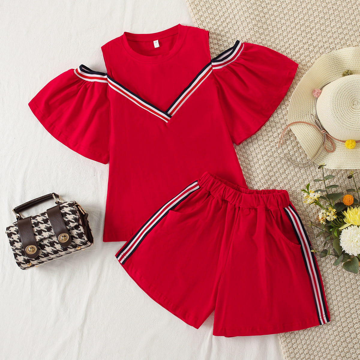 Girls Summer Stripes Color-block Casual T-shirt & Denim Shorts Wholesale
