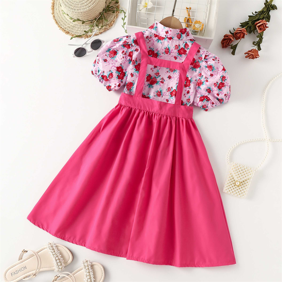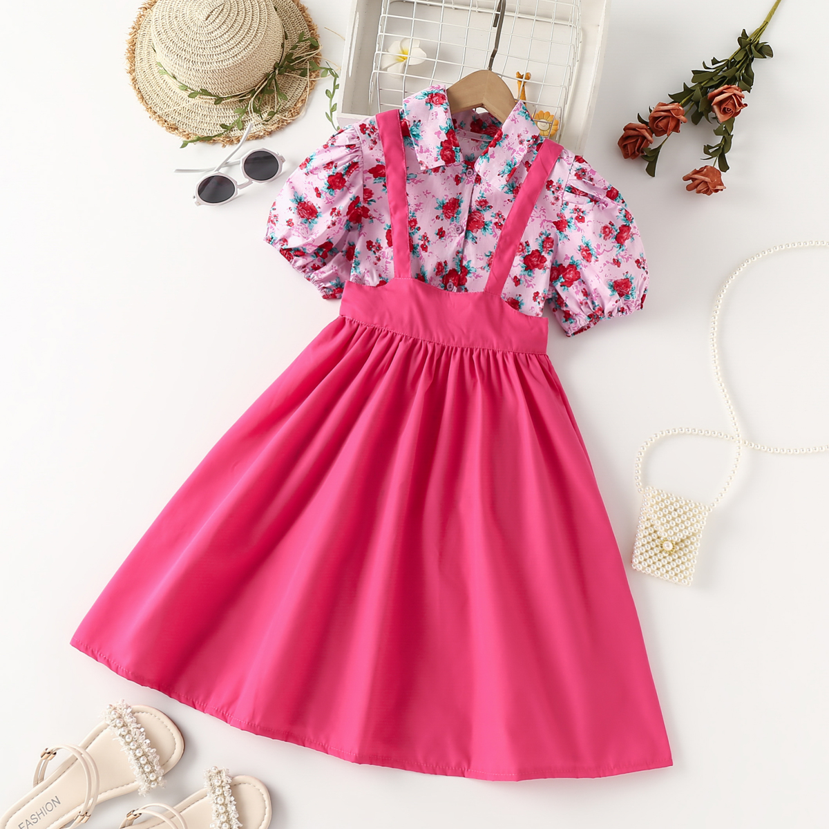 Girls' Summer Sweet Floral Puff Sleeve Shirt Suspender Skirt Suit Wholesale