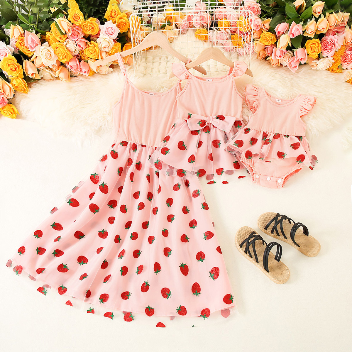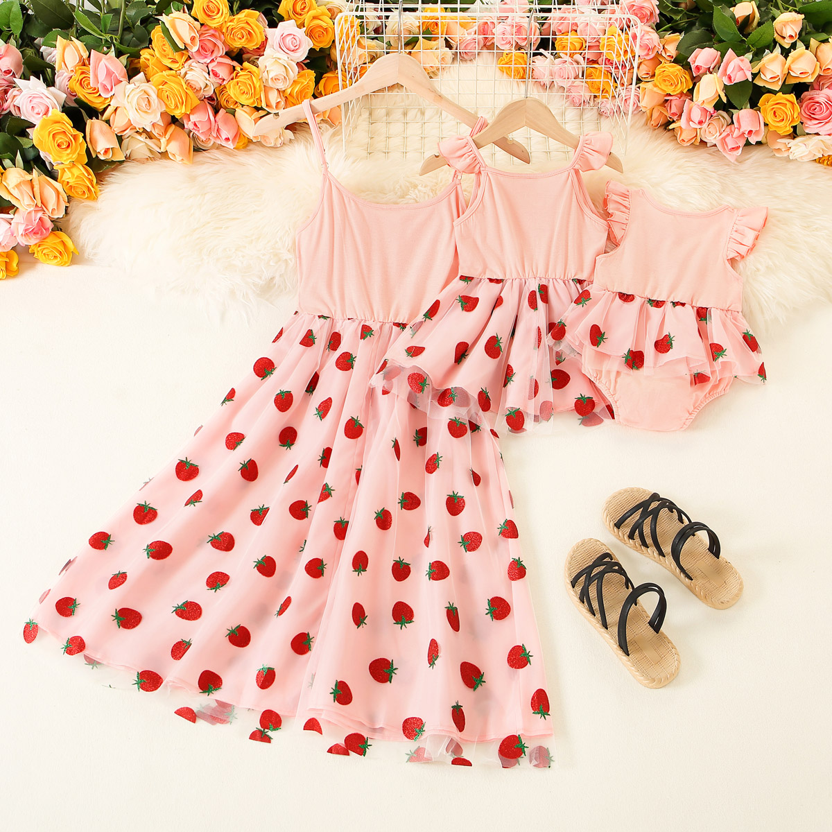 Sweet Strawberry Print Sleeveless Dress for Mom and Me Wholesale