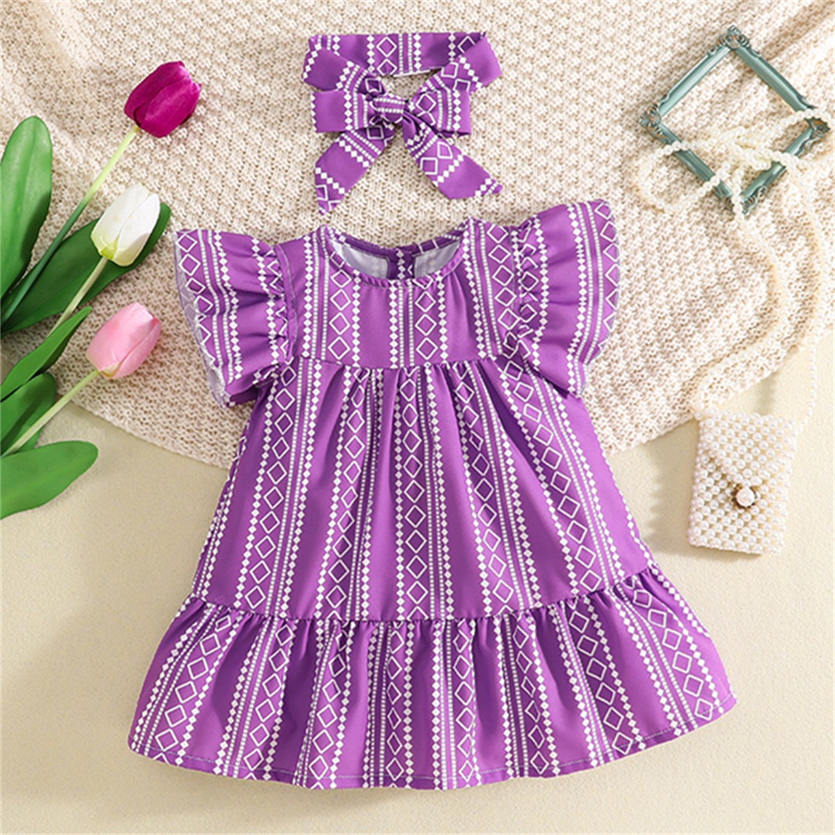 Toddler Girls Stripes Solid Boho Round Neck Dress Wholesale