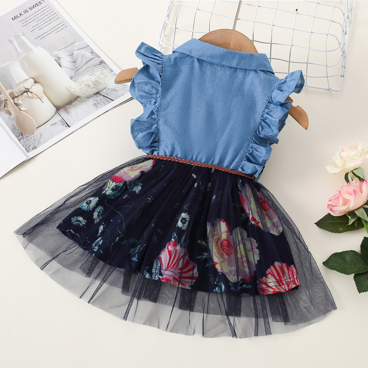 Toddler Girls Lapel Princess Skirt Color-block Sweet Ruffles Mesh Dress Wholesale