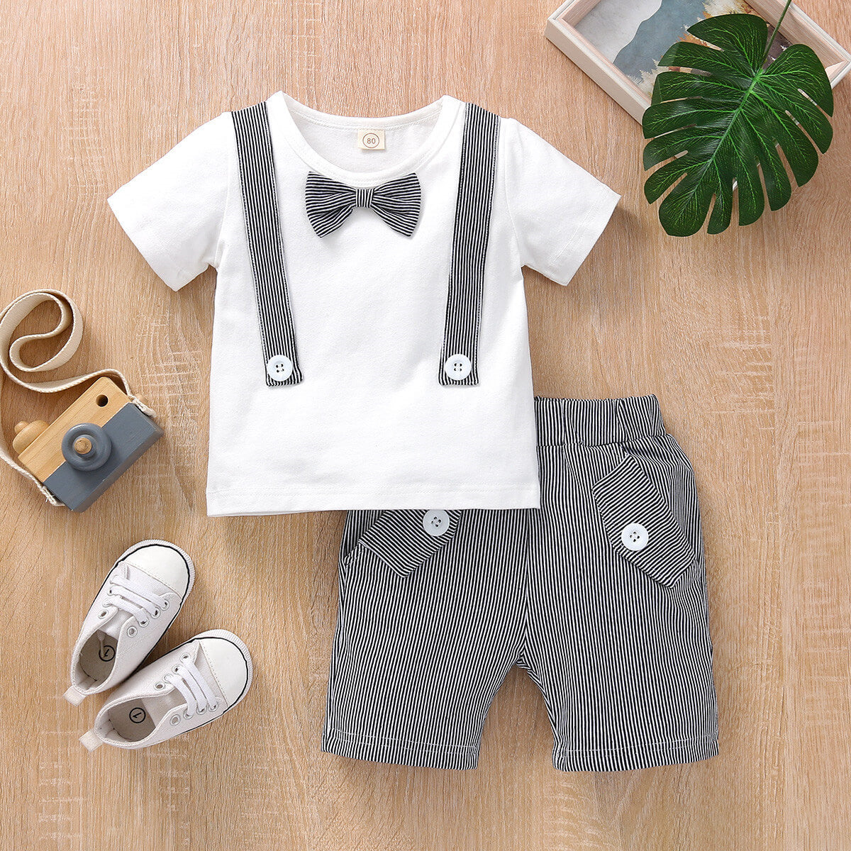 Baby Boy Solid Color Gentleman Bow-knot T-Shirt & Stripes Shorts Wholesale