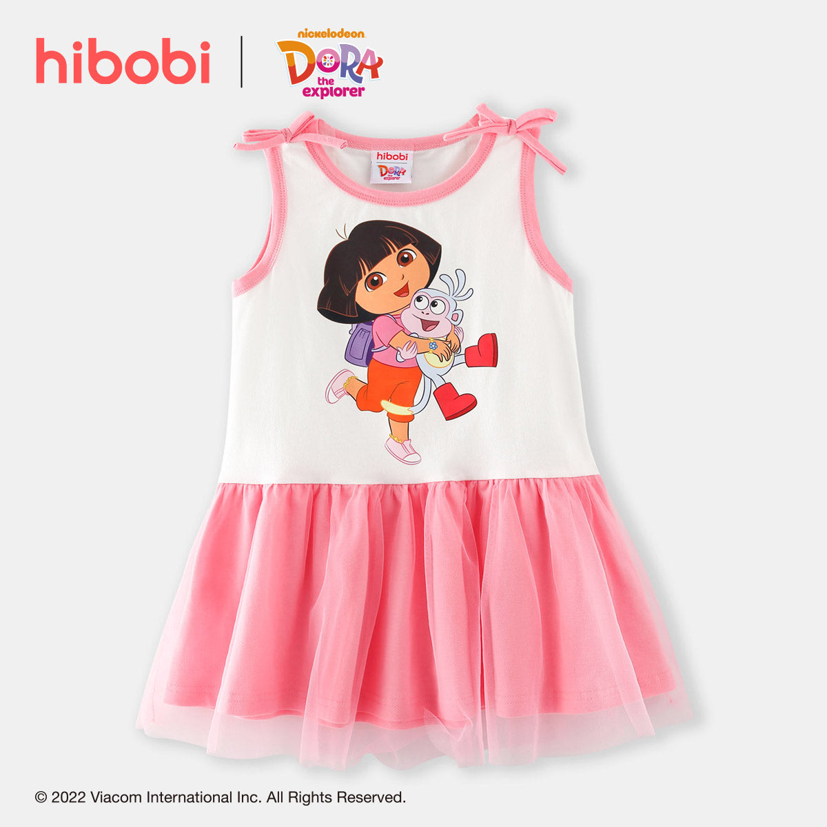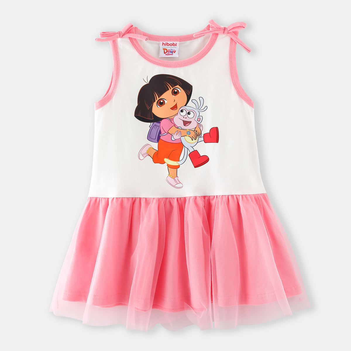 hibobi x Dora Toddler Girls Cute Sweet Printing Cotton Mesh Hem Bow Knot Decor Dress Wholesale