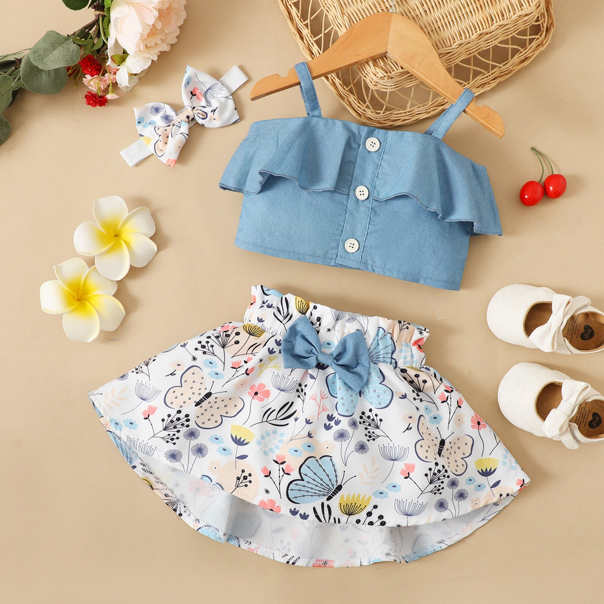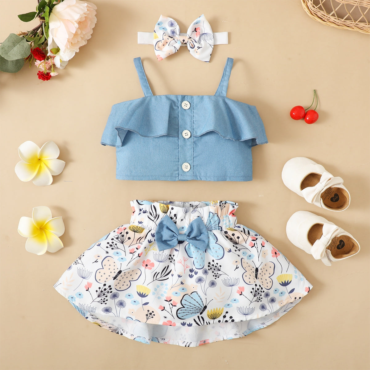 Baby Girl Beautiful Solid Ruffle Top And Floral Skirt with Headband Wholesale