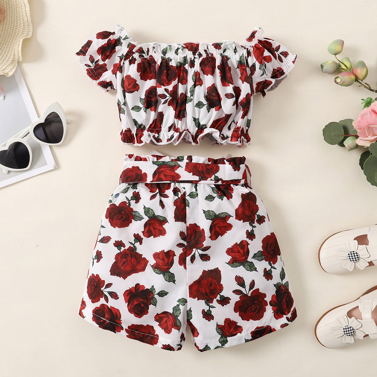 Toddler Girls Slash Neck Floral Ruffled Sleeve Top & Shorts Wholesale