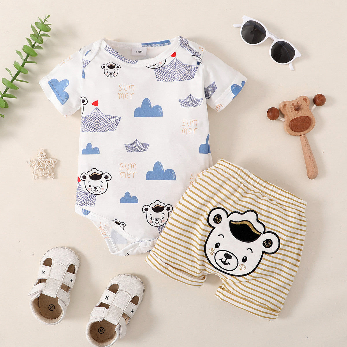 Baby Boy Bear Cloud Pattern Bodysuit & Back Applique Bear Stripes Shorts Wholesale