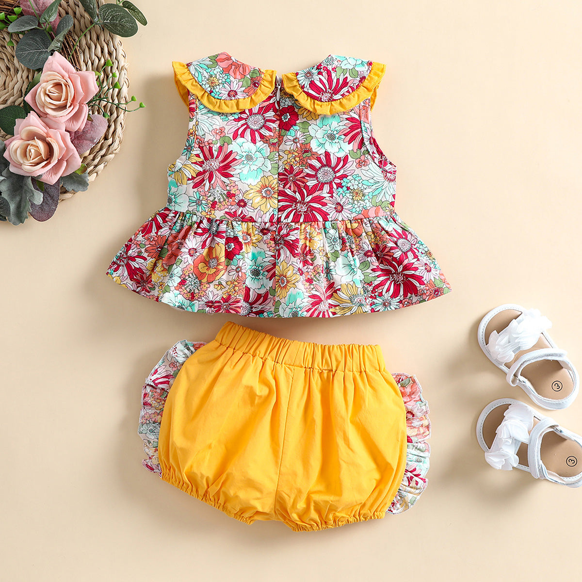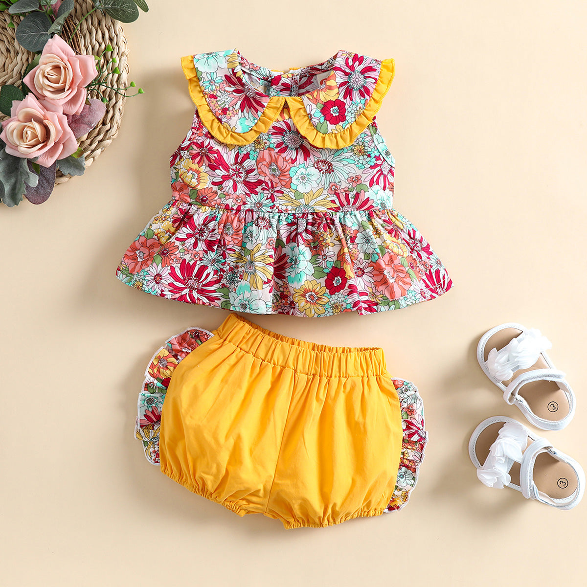 Baby Girl Beautiful Floral Ruffle Collar Top And Patchwork Shorts Wholesale