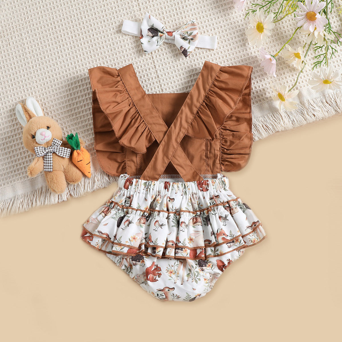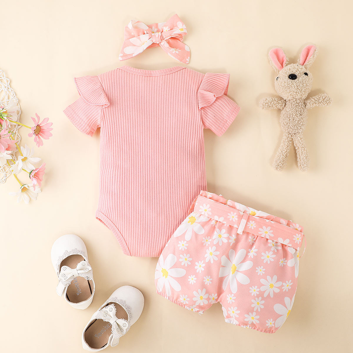 Baby Girl Beautiful Ruffle-sleeve Bodysuit And Floral Shorts with Headband Wholesale