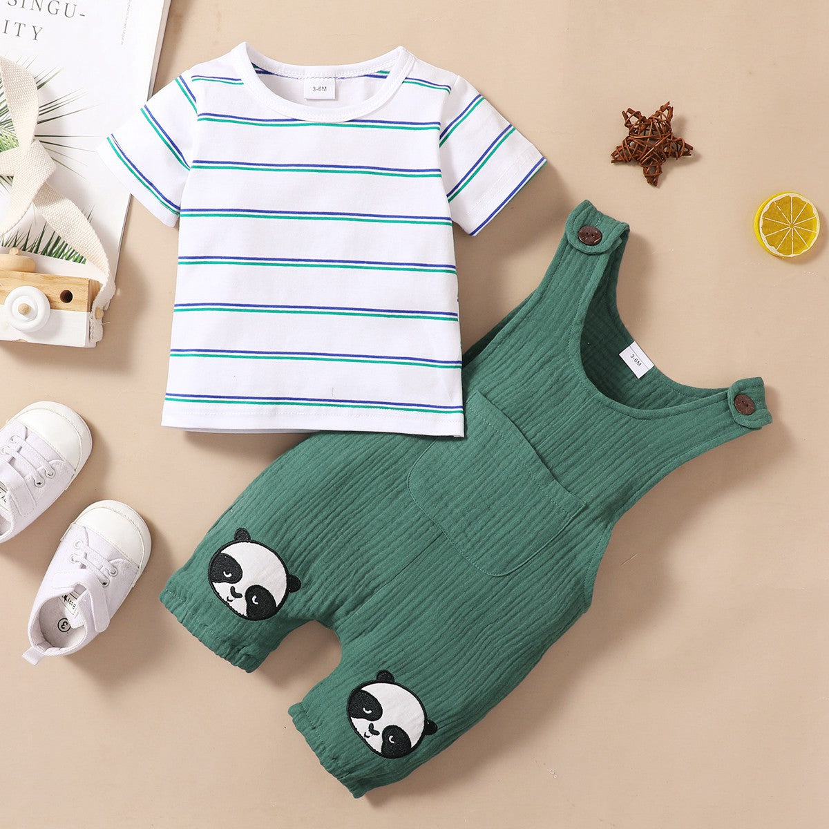 Baby Boy Cute Stripes Top And Panda Applique Overalls Wholesale