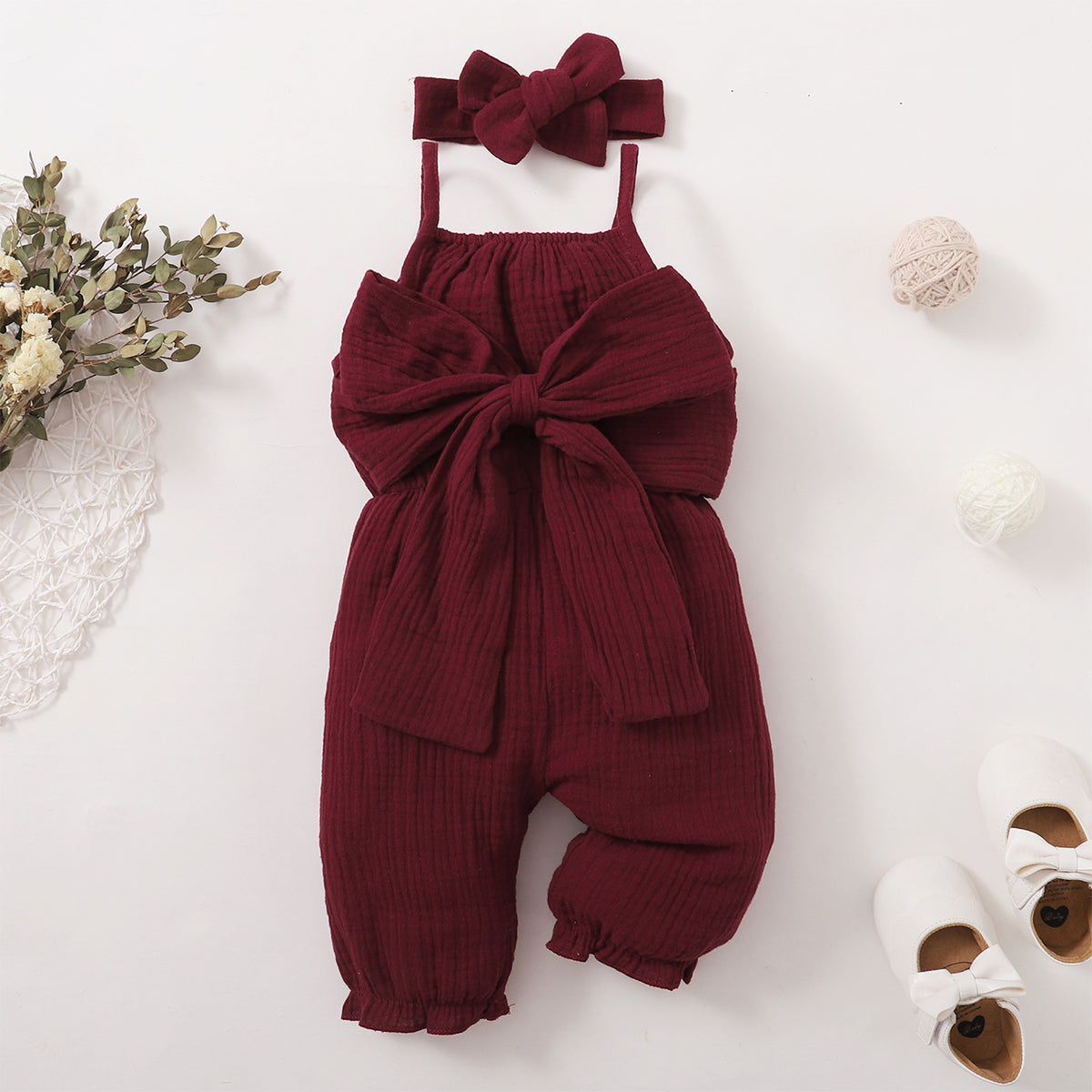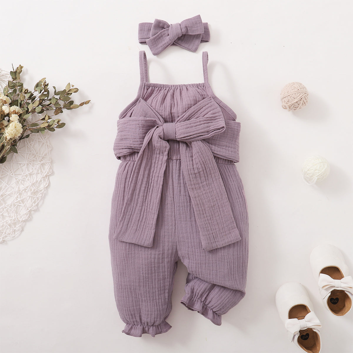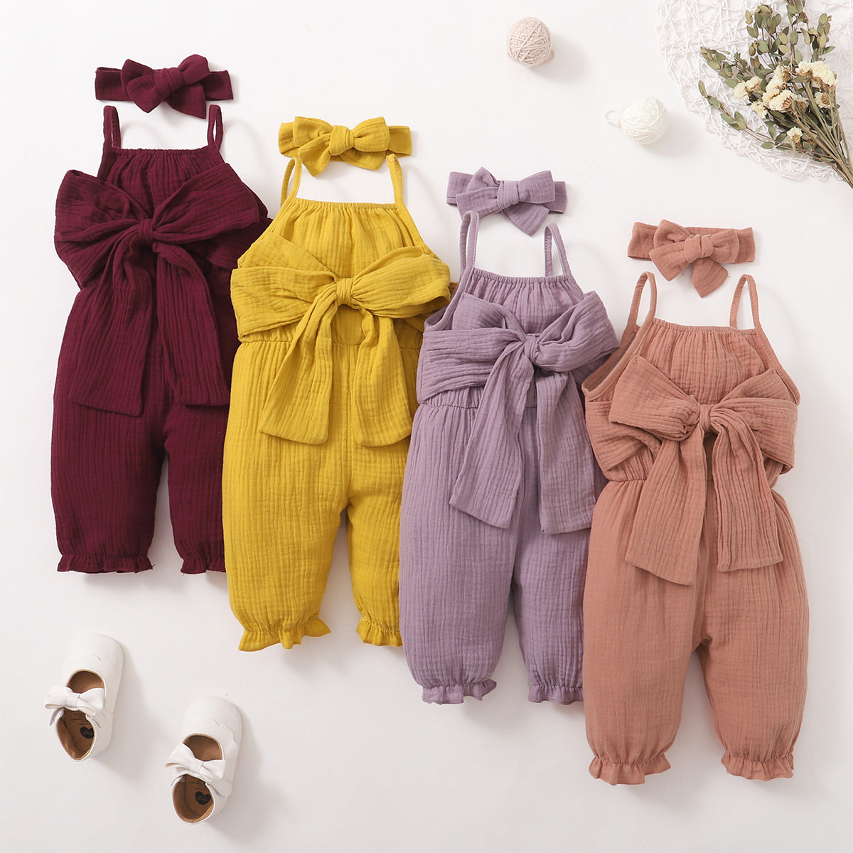 Baby Girl 2 Pieces Solid Color Bow Decor Suspender Jumpsuit & Headband Wholesale