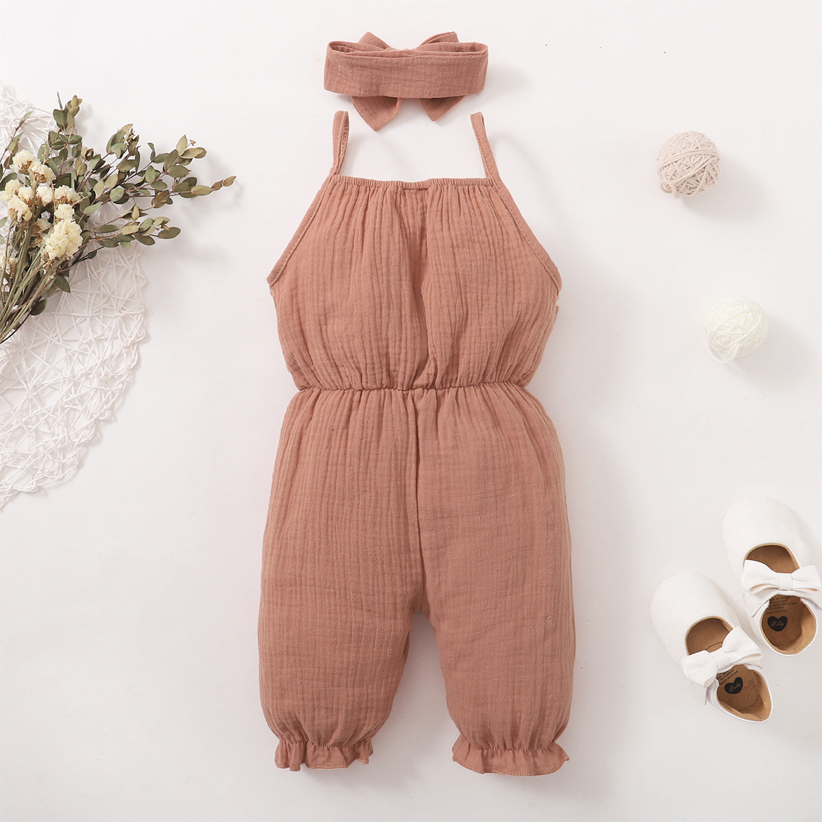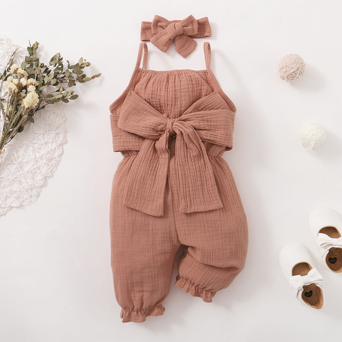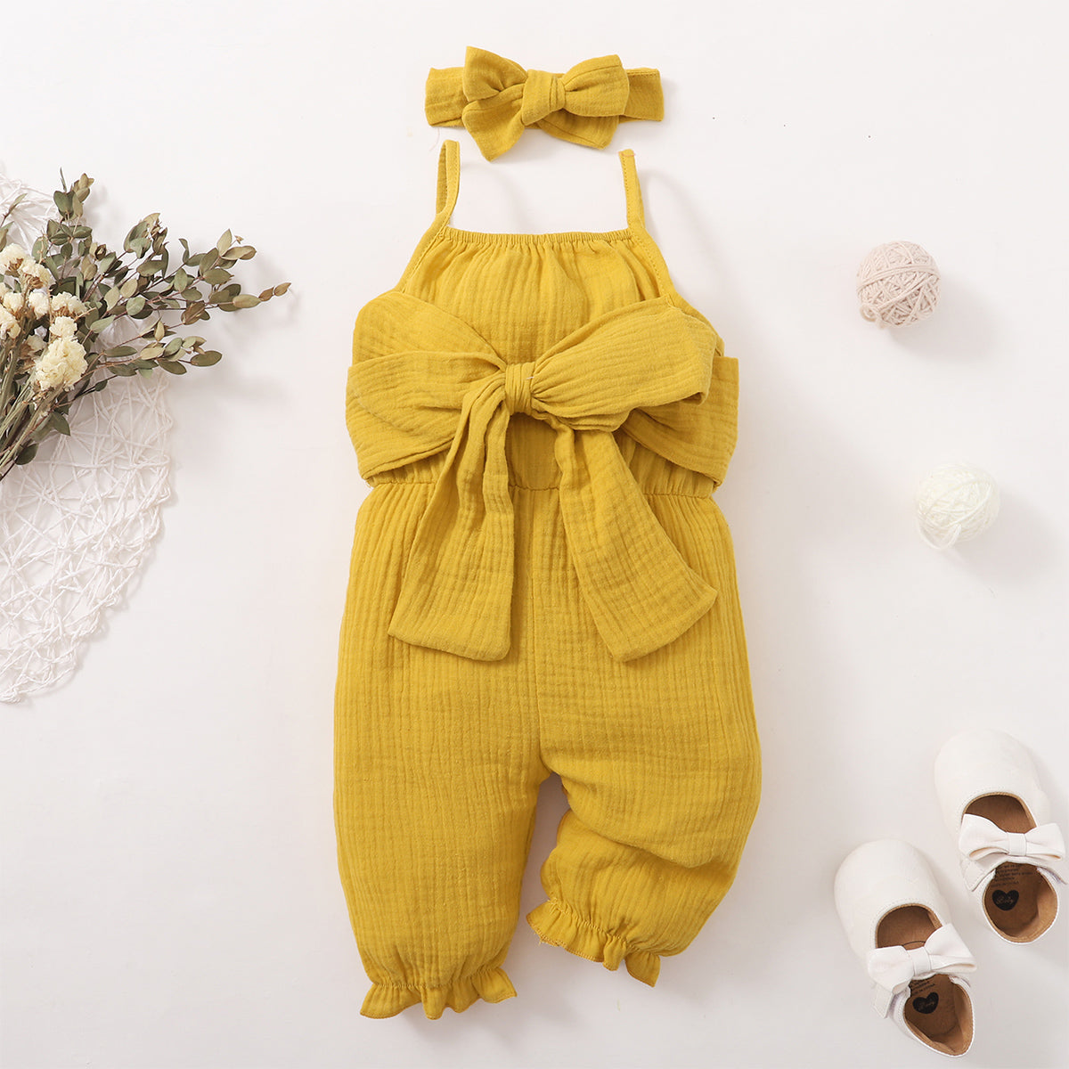 Baby Girl 2 Pieces Solid Color Bow Decor Suspender Jumpsuit & Headband Wholesale