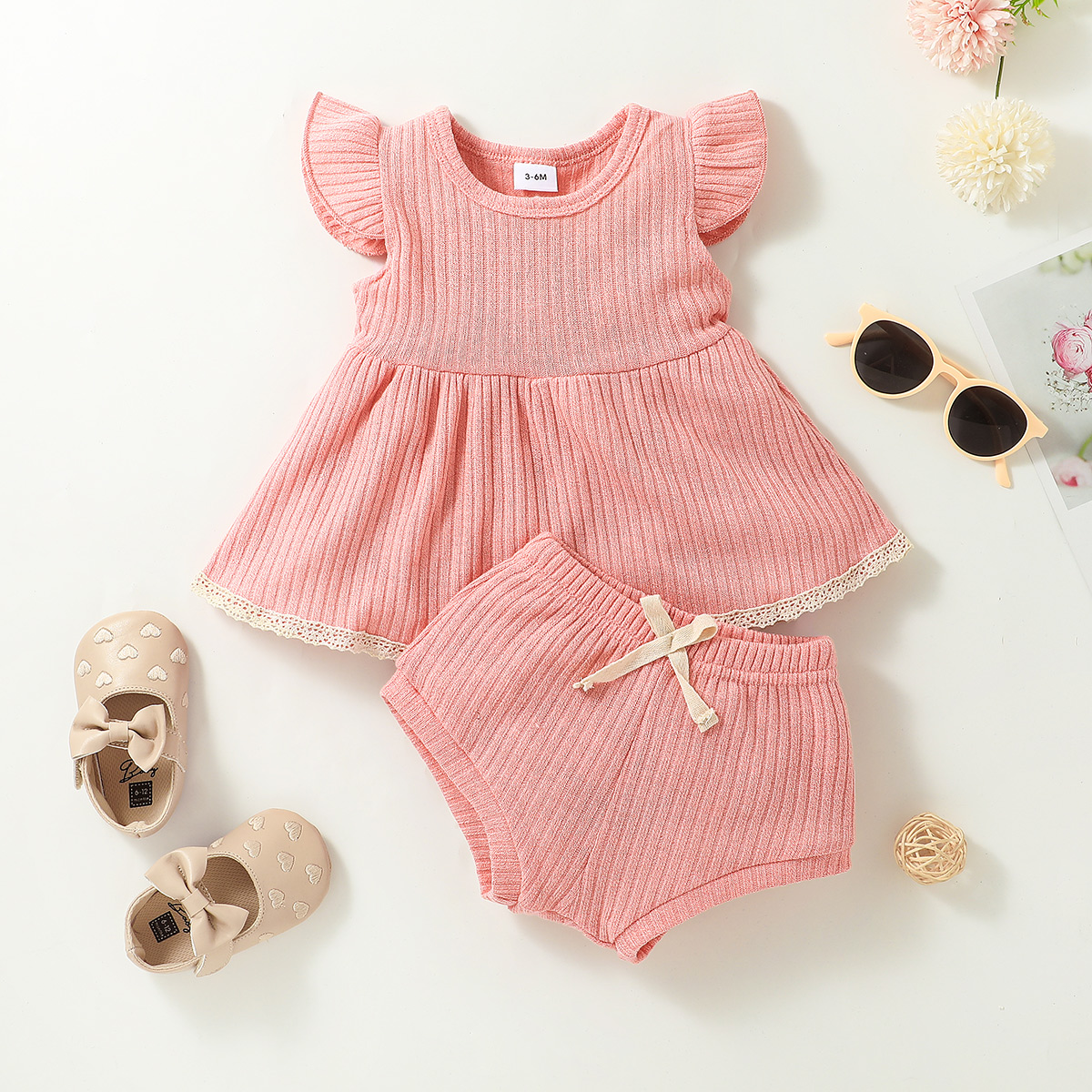 Baby Girl Beautiful Solid Colour Ruffle Sleeve Top And Shorts Wholesale